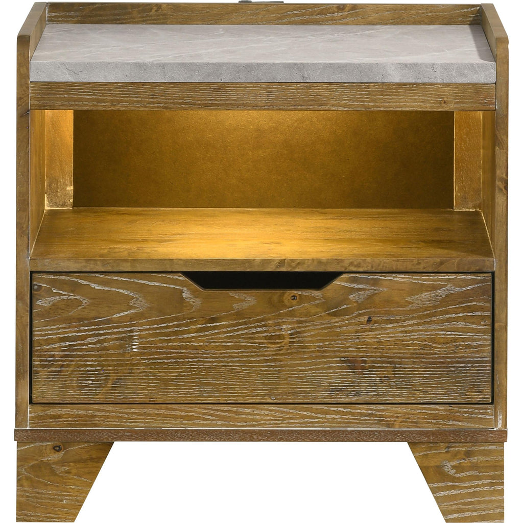 • One-drawer nightstand blends rustic texture with modern functionality and clean lines