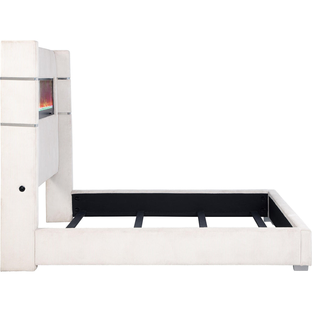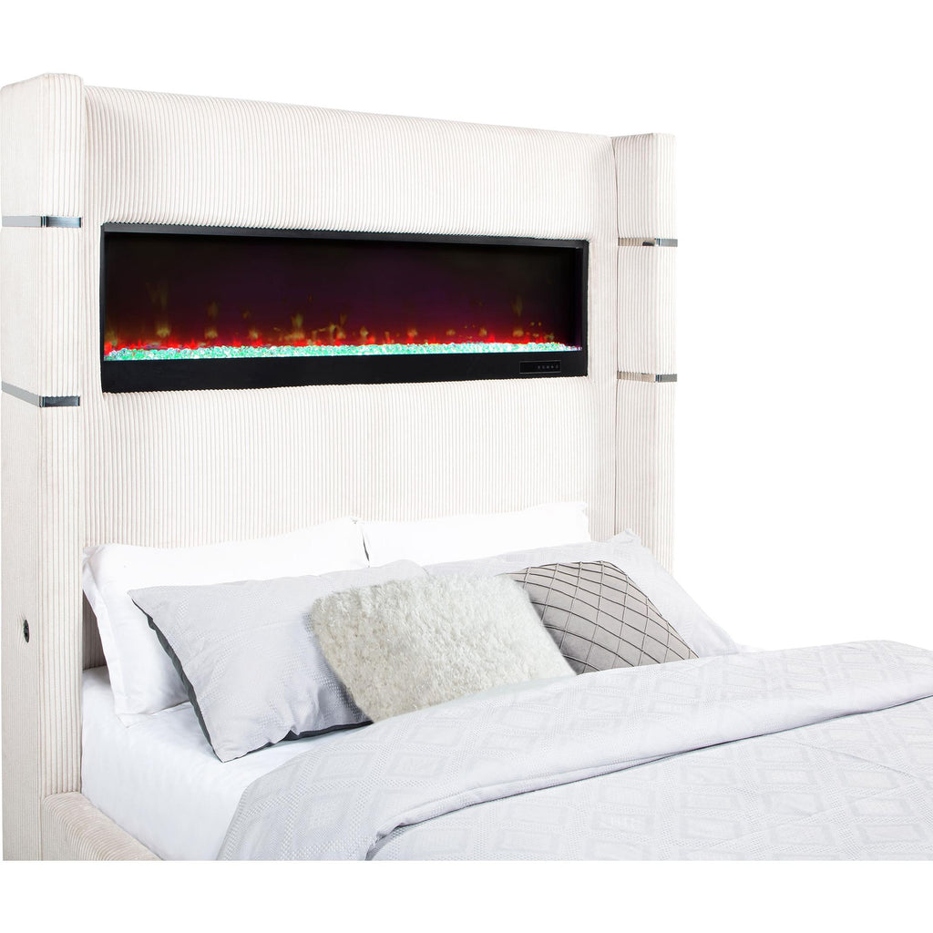 • Upholstered wingback panel bed with integrated flame box
